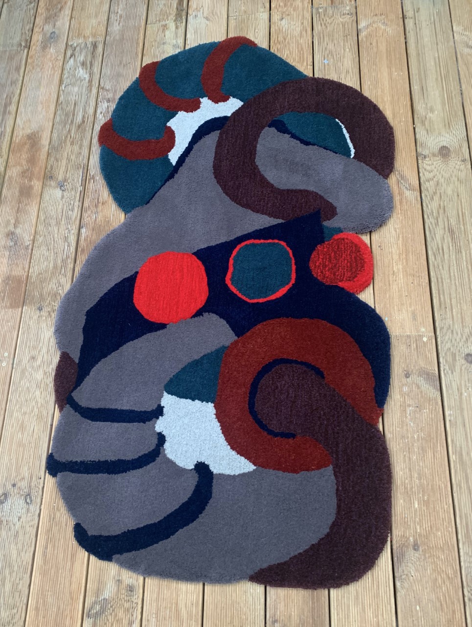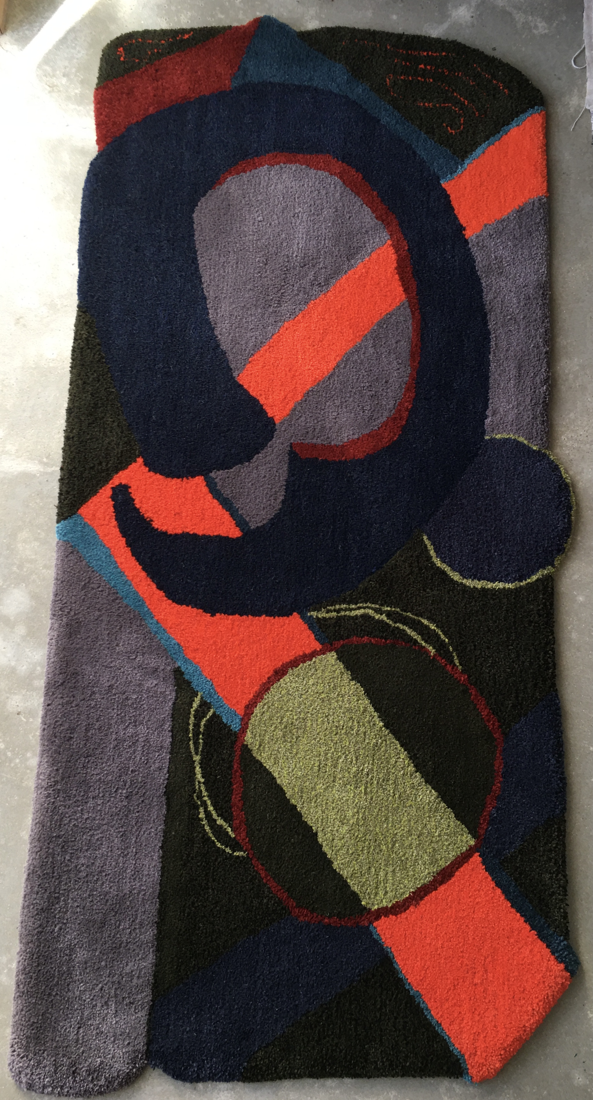 I made my first rug over 30 years ago. It has moved house with me several times and is still on my living room floor looking great. I aspire to evoke energy and movement in my work, using gestural lines, colour and variety of pile heights. Taking inspiration from the natural world, my garden and reflections in water.